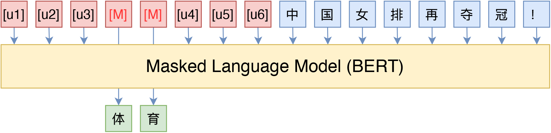 MLM MLM,全称 “Masked Language Model”,可以翻译为 “掩码语言模型”,实际上就是一个完形填空任务,随机 Mask 掉文本中的某些字词,然后要模型去预测被 Mask 的字词,示意图如下: